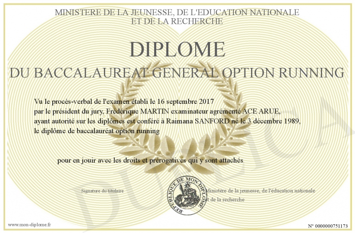 Envoyez par email votre Diplôme du baccalaureat général option running personalisé