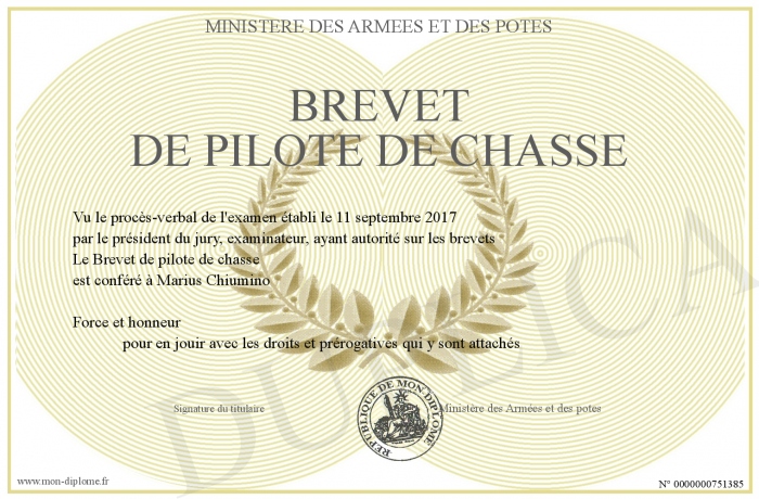 Envoyez par email votre Brevet de pilote de chasse personalisé