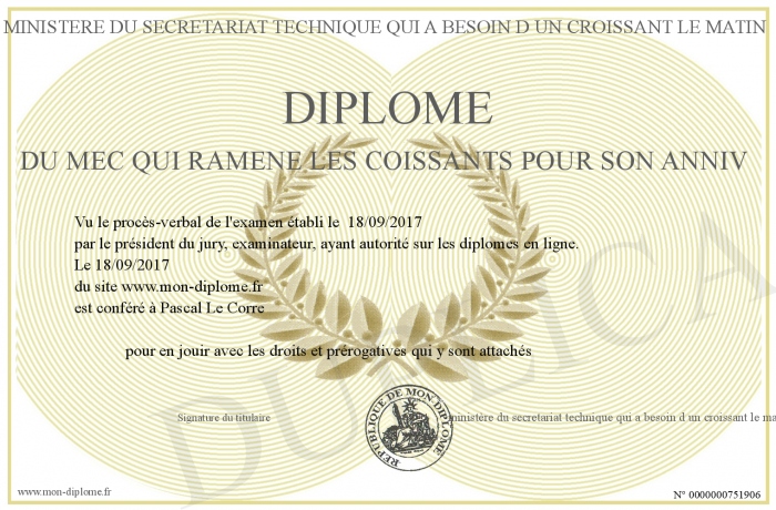 Envoyez par email votre Diplome du mec qui ramene les coissants pour son anniv personalisé