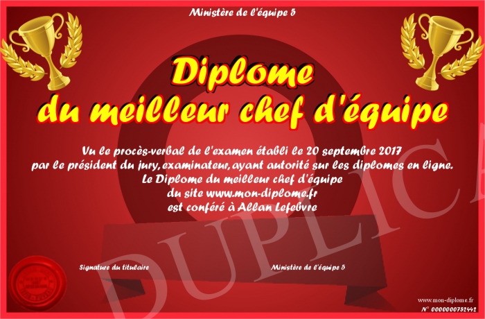 Envoyez par email votre Diplôme du meilleur chef d'équipe personalisé