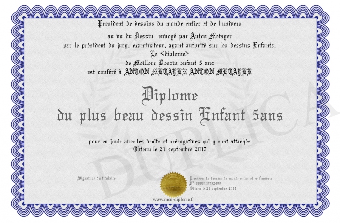 Envoyez par email votre Diplôme du plus beau dessin Enfant 5ans personalisé