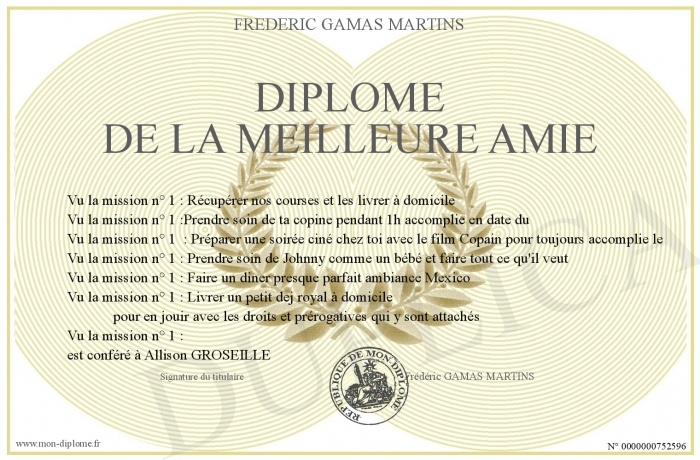 Envoyez par email votre Diplôme de la Meilleure Amie personalisé