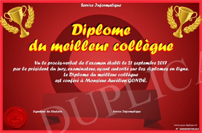 Envoyez par email votre Diplome du meilleur collègue personalisé