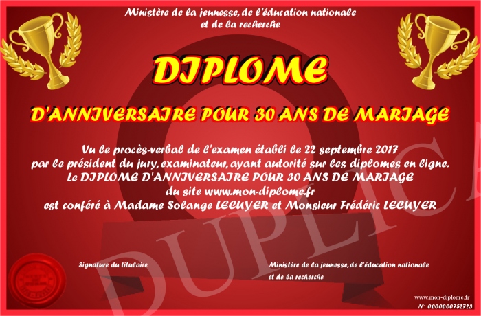 Envoyez par email votre DIPLOME D'ANNIVERSAIRE POUR 30 ANS DE MARIAGE personalisé