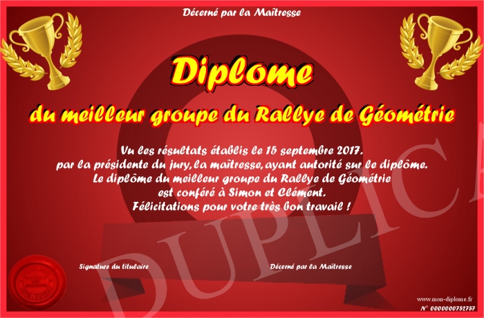 Envoyez par email votre Diplôme du meilleur groupe du Rallye de Géométrie personalisé