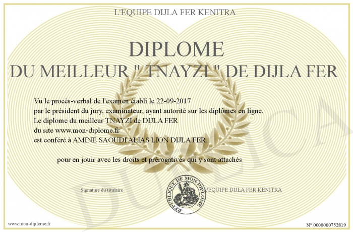 Envoyez par email votre Diplôme du MEILLEUR - TNAYZI - DE DIJLA FER personalisé