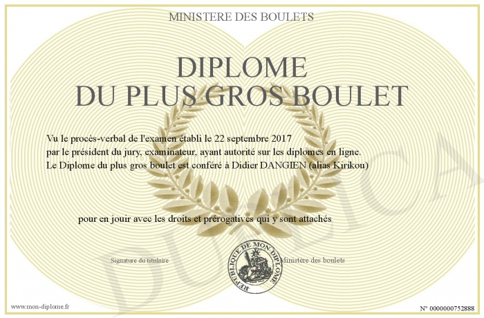 Envoyez par email votre Diplôme du plus gros boulet personalisé