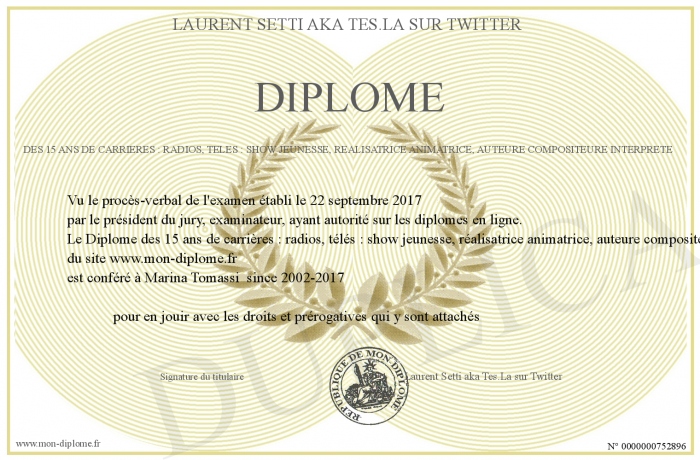 Envoyez par email votre Diplôme des 15 ans de carrières : radios, télés : show jeunesse, réalisatrice animatrice, auteure compositeure interprète personalisé