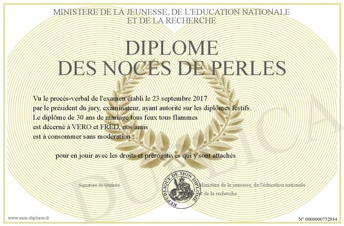 Envoyez par email votre Diplôme des noces de perles personalisé