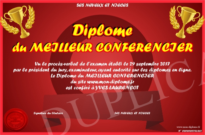 Envoyez par email votre Diplome du MEILLEUR CONFERENCIER personalisé