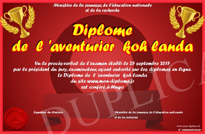 Envoyez par email votre Diplôme de l 'aventurier koh landa personalisé