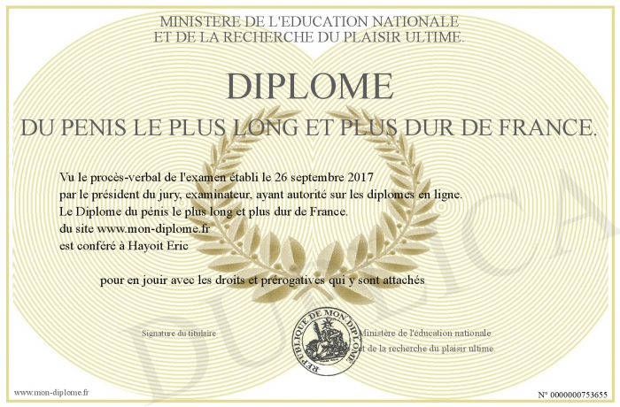 Envoyez par email votre Diplôme du pénis le plus long et plus dur de France. personalisé
