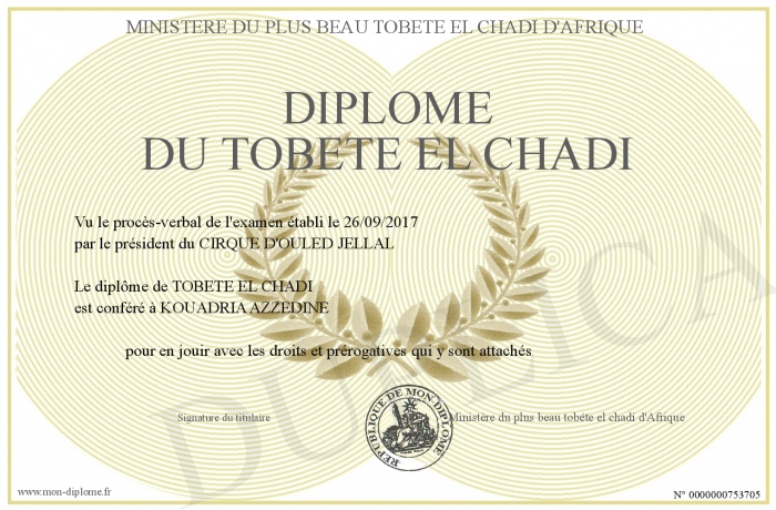 Envoyez par email votre Diplôme du Tobéte el CHADI personalisé