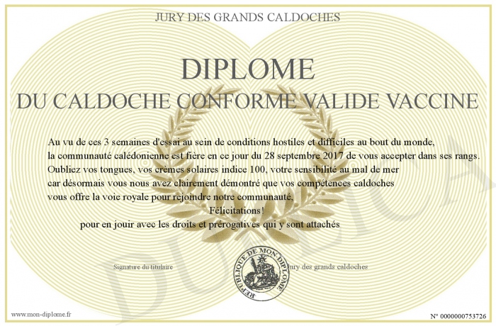 Envoyez par email votre Diplôme du Caldoche Conforme Validé Vacciné personalisé
