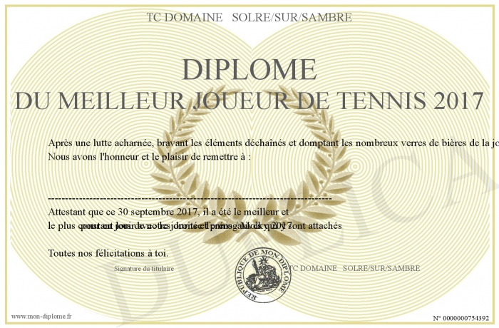 Envoyez par email votre Diplome Du Meilleur Joueur De Tennis 2017 personalisé