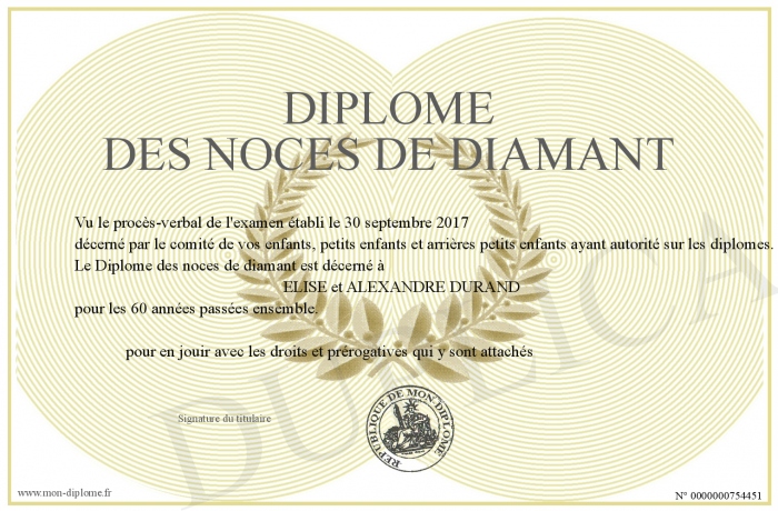 Envoyez par email votre Diplôme des noces de diamant personalisé