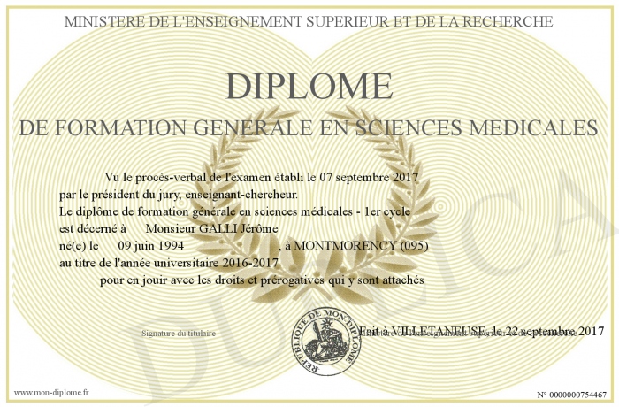 Envoyez par email votre Diplôme de formation générale en sciences médicales personalisé