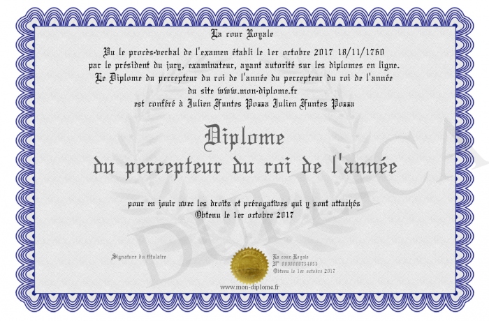 Envoyez par email votre Diplôme du percepteur du roi de l'année personalisé