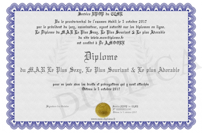 Envoyez par email votre Diplôme du M.A.R Le Plus Sexy, Le Plus Souriant & Le plus Adorable personalisé