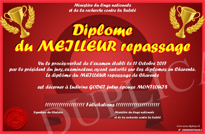 Envoyez par email votre Diplôme du MEILLEUR repassage personalisé