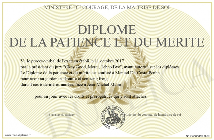 Envoyez par email votre Diplôme de la patience et du mérite personalisé