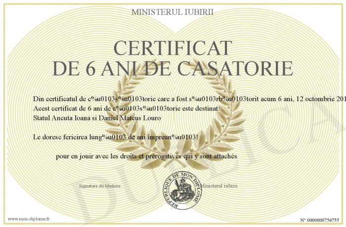 Envoyez par email votre Certificat de 6 ani de casatorie personalisé