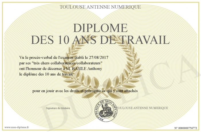 Envoyez par email votre Diplôme des 10 ans de travail personalisé