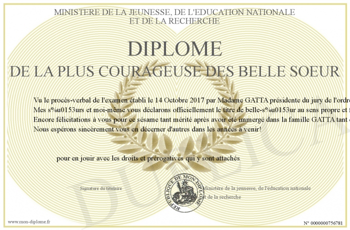 Envoyez par email votre Diplôme de la plus courageuse des belle soeur personalisé