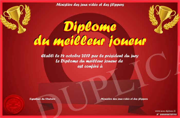 Envoyez par email votre Diplôme du meilleur joueur personalisé