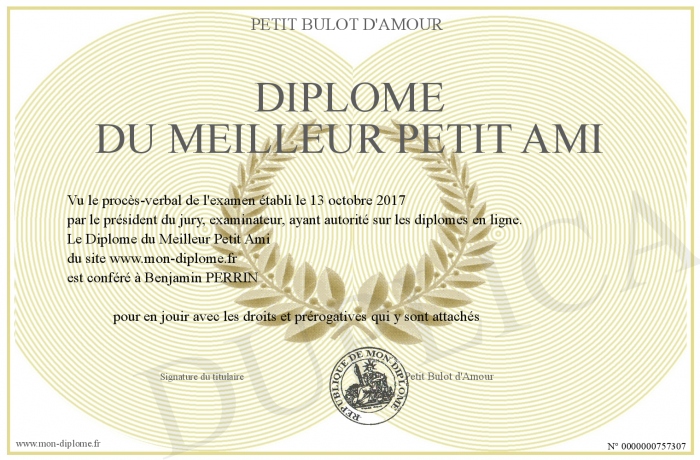 Envoyez par email votre Diplôme du Meilleur Petit Ami personalisé