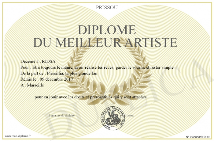 Envoyez par email votre Diplôme du meilleur artiste personalisé