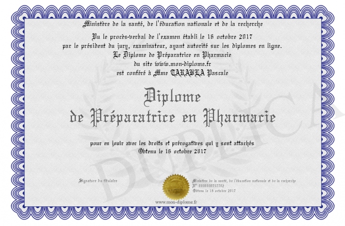 Envoyez par email votre Diplôme de Préparatrice en Pharmacie personalisé
