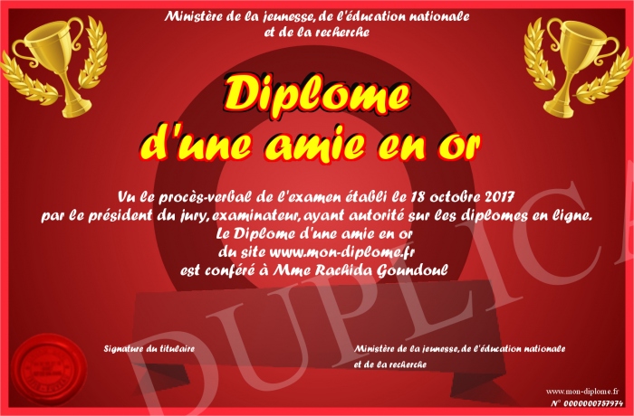 Envoyez par email votre Diplôme d'une amie en or personalisé