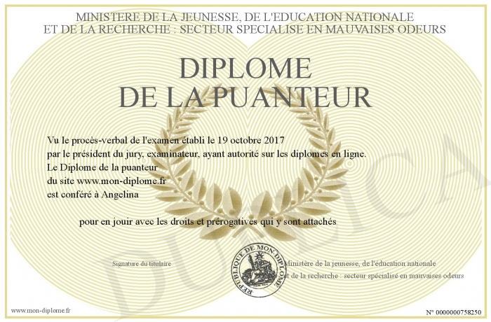 Envoyez par email votre Diplôme de la puanteur personalisé