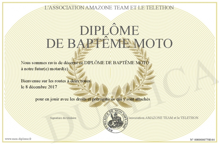 Envoyez par email votre DIPLÔME DE BAPTÊME MOTO personalisé
