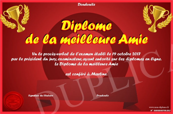Envoyez par email votre Diplome de la meilleure Amie personalisé