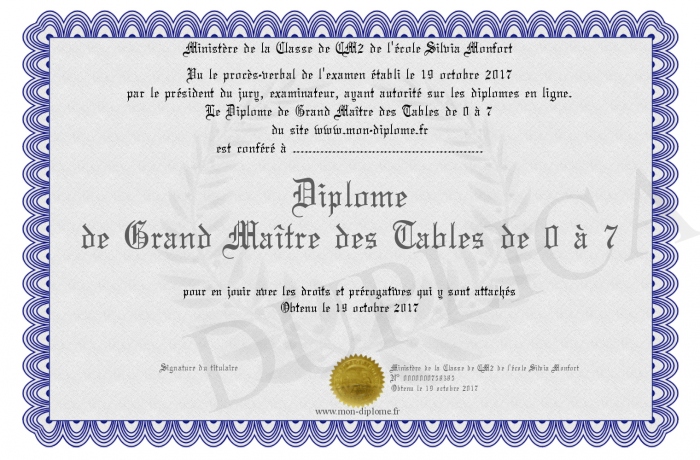 Envoyez par email votre Diplôme de Grand Maître des Tables de 0 à 7 personalisé