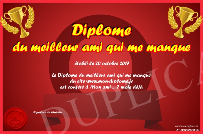 Envoyez par email votre Diplôme du meilleur ami qui me manque personalisé