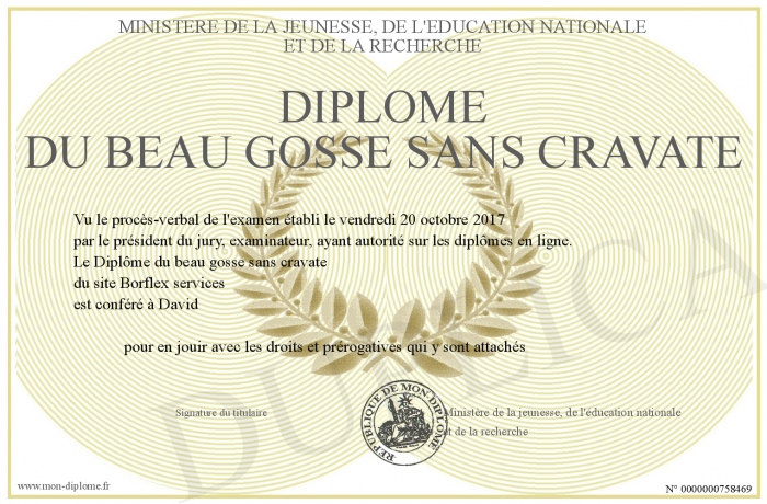 Envoyez par email votre Diplôme du beau gosse sans cravate personalisé