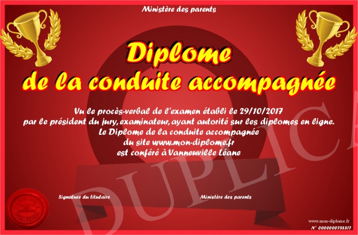 Envoyez par email votre Diplôme de la conduite accompagnée personalisé