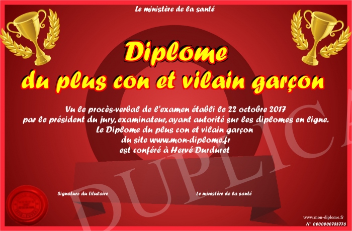 Envoyez par email votre Diplôme du plus con et vilain garçon personalisé