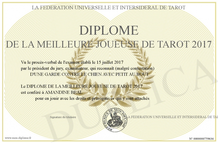 Envoyez par email votre DIPLOME DE LA MEILLEURE JOUEUSE DE TAROT 2017 personalisé