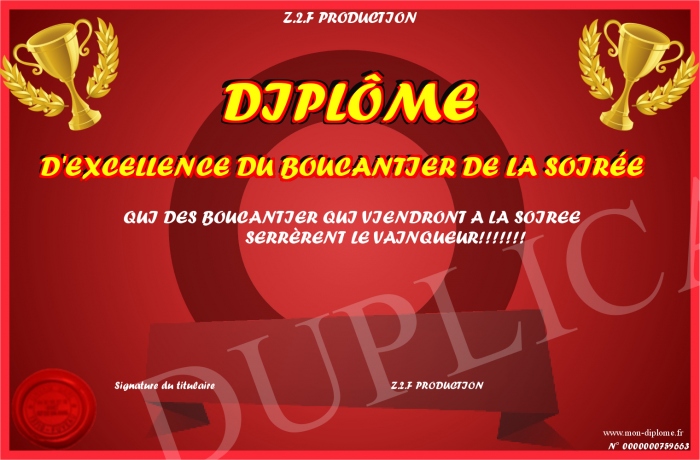 Envoyez par email votre DIPLÔME D'EXCELLENCE DU BOUCANTIER DE LA SOIRÉE personalisé