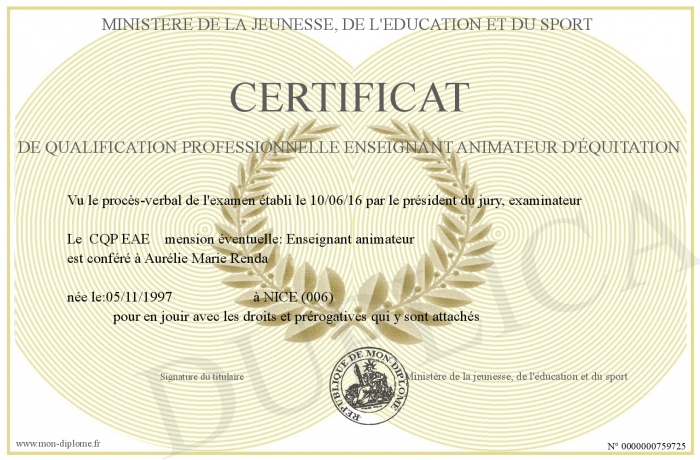 Envoyez par email votre Certificat de Qualification Professionnelle Enseignant Animateur d'Équitation personalisé