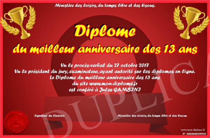 Envoyez par email votre Diplôme du meilleur anniversaire des 13 ans personalisé