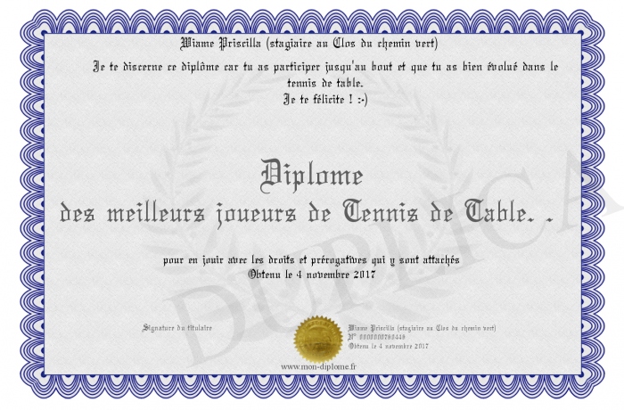 Envoyez par email votre Diplôme des meilleurs joueurs de Tennis de Table. . personalisé