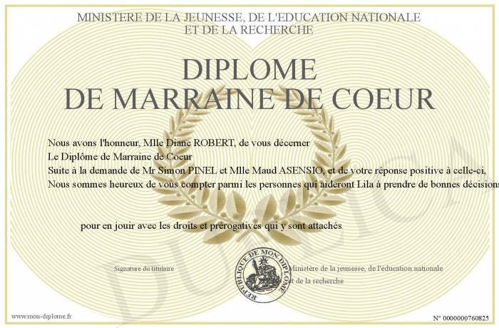 Envoyez par email votre Diplôme de marraine de coeur personalisé
