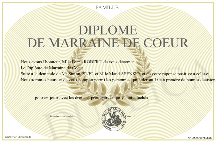Envoyez par email votre Diplôme de marraine de coeur personalisé