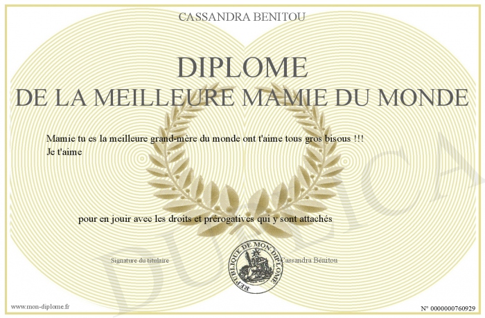 Envoyez par email votre Diplôme de la meilleure mamie du monde personalisé