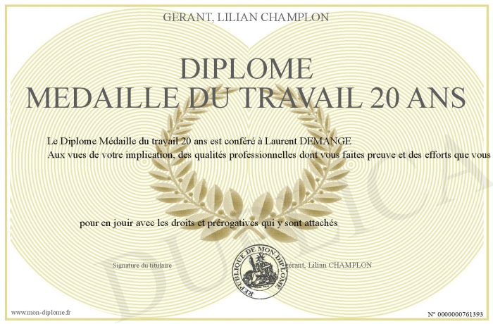 Envoyez par email votre Diplôme Médaille du travail 20 ans personalisé